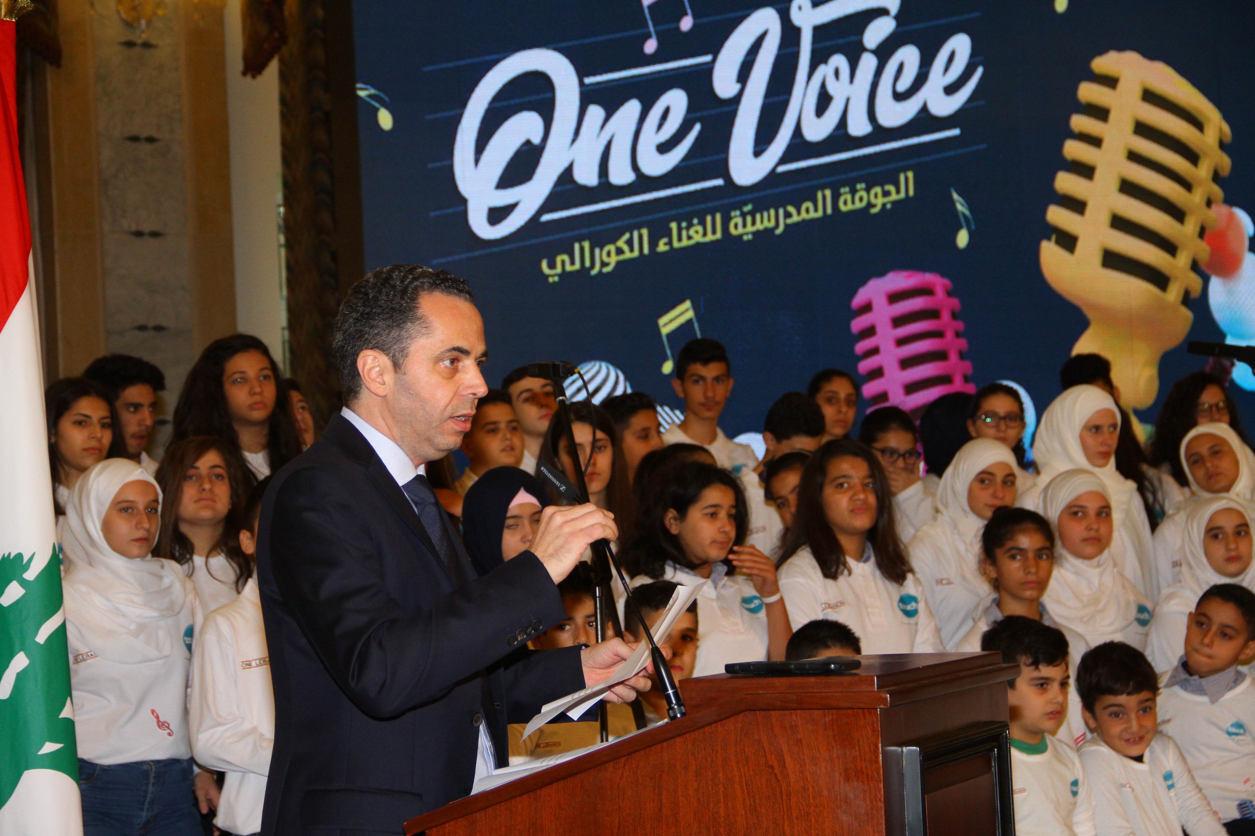 After the speeches, around 120 students from the four selected public schools offered a small performance of meaningful songs. The performance ended with Tania Kassis joining the One Voice choir on stage to sing together her hit song “Trabak Ya Lebnan” written and composed for her by Elias Rahbani.